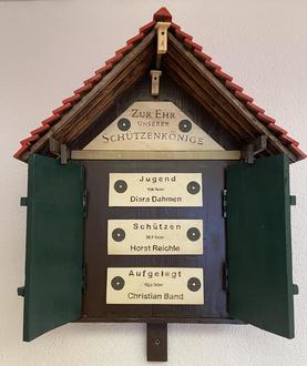 Damit jeder, der das Schützenheim besucht, über den aktuellen Stand unserer Schützenkönige informiert ist, wurden ihre Namen wieder auf hölzernen Schildern in unserem „Königshaus“ veröffentlicht.