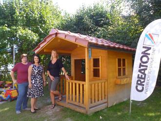 Übergabe des Spielhäuschens v.l. Anja Potz (EB Vorsitzende) Tatjana Grau (Fa. Creaton), Uta Prinz (KiTa hl. Kreuz Hochwang)