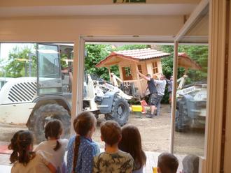 Fa. Glöckler stellt das Spielhäuschen unter „strenger“ Beobachtung der KiTa-Kinder in den Garten