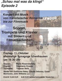 Die französische und deutsche Musik der Romantik beeinflussen bis heute die moderne Filmmusik. Mit Werken aus dieser Zeit und Filmmusiken von Ennio Morricone, John Williams, Henry Mancini, Howard Shore und weiteren Kompositionen aus der Filmbranche entführen Sie die drei Künstler*innen auf eine musikalische und bildliche Reise von Paris bis Los Angeles. Stephanie Knauer und Thomas Seitz bilden seit vielen Jahren ein perfekt aufeinander abgestimmtes Duo und werden dieses mal zusammen mit ihrem „Stargast“ Maria Rosendorfsky in der ehemaligen Synagoge in Ichenhausen auftreten. Zwischen und während den Musikstücken können Sie Bilder, Kunstwerke und Filmausschnitte bestaunen. Am Ende des Konzertes gibt es dann noch ein "Meet and Greet"!