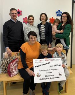 Die Leiterin der Kindertagesstätte Storchennest Elvira Mader freut sich zusammen mit Kindern der Kita über eine Spende in Höhe von 2.120 €. Ein Team aus Mitarbeitern des Rathauses und des Elternbeirates der Kita hatte an fünf Freitagabend-Open-Air-Konzerten im Sommer im Rahmen von KultIchenhausen Cocktails zubereitet und verkauft.