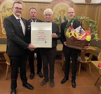Franz Bucher führte den Krieger- und Soldatenverein Deubach e. V. 29 Jahre als erster Vorstand und das mit Leib und Seele. Ausflüge, Restaurierungsarbeiten am Heldengrab und an den Erinnerungstafeln der gefallenen Deubacher und Ebersbacher Soldaten, Fahnenweihe, Vereinsjubiläum. Um nur einige Dinge zu nennen die Franz Bucher mit Engagement vorangetrieben, organisiert und durchgeführt hat. Markus Spengler und Werner Sailer (2. Vorstand) überreichten, zusammen mit Albert Dehm die Ernennungsurkunde und einen reichlich gefüllten Geschenkkorb als Würdigung und Anerkennung für dessen Lebenswerk. Mit dem Leitspruch des Vereins