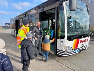 Nach einer herzlichen Begrüßung führte Frau Schmidt die Vorschulkinder zunächst in das Thema ein. Sie erklärte, warum es so wichtig ist, im Straßenverkehr aufmerksam zu sein, und zeigte ihnen, wie man eine Straße sicher überquert – besonders, wenn parkende Autos die Sicht behindern. Jedes Kind durfte unter ihrer Anleitung üben und meisterte die Aufgabe mit Bravour. Anschließend ging es zur Bushaltestelle. Dort lernten die Kinder, wie sie sich richtig anstellen, wo ihr Schulranzen beim Einsteigen hingehört und worauf sie beim Busfahren achten müssen. Passend dazu fuhr Herr Schorer von der Firma Probst mit seinem Bus vor. Begeistert begrüßten die Kinder den Busfahrer, stiegen ein und genossen die Fahrt zur Grundschule Ichenhausen.