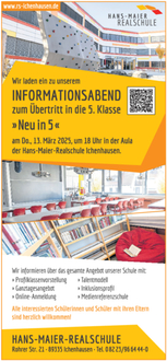 Die Hans-Maier-Realschule Ichenhausen stellt sich vor und lädt herzlich zum Informationsabend „Neu in 5“ zum Übertritt an die Staatliche Realschule Ichenhausen, am Donnerstag, den 13. März 2025, um 18:00 Uhr ein.