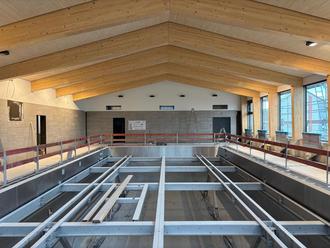 In der Mehrzweckhalle stehen als nächstes der Einbau der Prallwand und des Hallenbodens, die Installation der Küchentechnik an. Im Hallenbad ist die komplette Badtechnik im Untergeschoss installiert. Im Schwimmbecken ist die Edelstahleinfassung fertig, auch die Unterkonstruktion des Hubbodens.