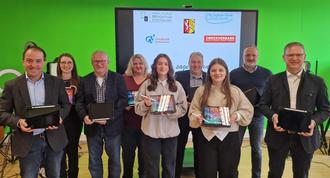 v.l.n.r.: Vorsitzender des Zweckverbandes Digitale Schulen im Landkreis Günzburg Tobias Bühler, Verwaltungsleiterin des Zweckverbandes Digitale Schulen Stefanie Hitzler, Pädagogischer Berater digitale Bildung und Koordinator des Zweckverband Digitale Schulen Jürgen Schlieszeit, Schülerin Christina Mössle, Schülerin Sarah Devoli, Leiter der Mittelschule Markus Mayer, Schülerin Arta Vessilaj, Stellvertretender Leiter der Mittelschule Patrick Kastner, Robert Strobel