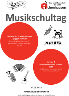 Am 17. Mai 2025 lädt die Sing- und Musikschule Ichenhausen ab 10:00 Uhr zum Musikschultag ein! Nach der Eröffnung der Grundausbildungsgruppen startet um 10:20 Uhr das große Instrumenten-Karussell: In mehreren Räumen finden parallel Kurzvorträge zu verschiedenen Instrumenten statt – im Wechsel mit Testphasen zum Ausprobieren. Klavier und Schlagzeug sind in der Musikschule untergebracht, alle anderen Instrumente in der Mittelschule Ichenhausen.