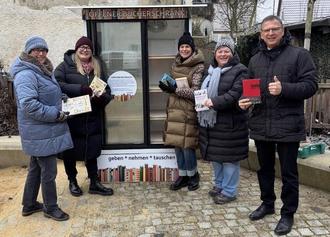 Von links: Barbara Kempfle, Katja Washington, Heike Glassenhart und Heidi Schneid von der Frauen Union und CSU Ichenhausen sowie Bürgermeister Robert Strobel, der sich über den neuen Treffpunkt für Leserinnen und Leser freut.
