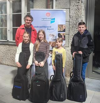 Das Gitarrenquartett aus der Klasse von Peter Merz – bestehend aus Luisa Bisle, Matilda Jehle, Naemi Trautwein und Felix Göder – überzeugte die Jury mit seinem musikalisch anspruchsvollen Programm und wurde mit 23 Punkten sowie einem 1. Preis ausgezeichnet.