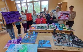 Nach dem gemeinsamen Mittagessen konnten die Kinder aus dem bereitstehenden Verpackungsmüll dreidimensionale Collagen, sogenannte Assemblages, erstellen. Mit Feuereifer wurden Joghurtbecher, Pappschachteln, Dosen und Kleiderbügel mit Heißkleber auf den Leinwänden befestigt - sogar Obstnetzte kamen zum Einsatz. Anschließend wurde alles mit einer Acrylfarbe bemalt. War es Zufall, dass das Bild der Jungs überwiegend schwarz gestaltet wurde; die Collagen der Mädchen eher farbig? Jedes Kunstwerk ein Unikat!