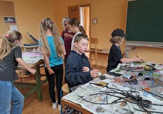 In der Gemeindebücherei konnten sich die Kinder zum Thema passende Bücher aussuchen bevor es dann ans gemeinsame Müllsammeln ging. Über den Sportplatz und Schulhof ging es bis zum Rathausplatz. Der eingesammelte Müll wurde gleich sortiert. Nicht brauchbarer Abfall wurde entsorgt und einzelne verwertbare Behältnisse wurden im Werkraum der Schule gewaschen, um sie später für das Kunstprojekt zu verwenden.
