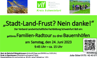Der Verband Landwirtschaftliche Fachbildung Schweinfurt lädt gemeinsam mit dem Amt für Ernährung, Landwirtschaft und Forsten Schweinfurt ein zu einer geführten Familien-Radtour am Samstag, den 24. Juni 2023, 9:45 Uhr – ca. 15 Uhr Start ab Bahnhof Waigolshausen (Ankunft der Züge aus Schweinfurt bzw. Würzburg: ca. 9:30 Uhr.)