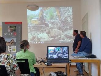 Beiden ist es ein großes Anliegen, den Charakter alter Gemäuer zu erhalten. Genauer hingeschaut begegnet einem der hiesige Sandstein überall: als Sitzgruppe, Bildstock, am Brunnen, in Kirchen und Schlössern, als Treppenaufgang oder Türumrahmung. Die Wertschätzung der vergangenen Baukunst ist maßgeblich für ihren Erhalt. Welche Tricks es hierzu gibt wusste Markus Full. Er stellte die hinterlüftete Fassade vor, die dazu beiträgt das ursprüngliche Mauerwerk trocken zu halten. Der Clou sind offene Fugen und ein gewisser Abstand zur Gebäudewand, sodass die Luft zirkulieren kann. Zahlreiche Fragen aus dem Publikum bestätigen das Interesse am Thema.