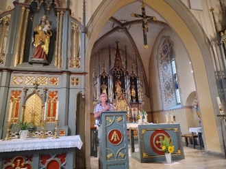Altbürgermeister Reinhold Stahl stellte den Innenraum der Kirche vor, mit Schutzpatron, Heiligenfiguren und Evangelisten. Eine Besonderheit ist das zweigeteilte Deckengemälde.