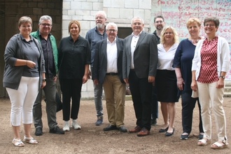 Vor Ort informierten sich Vertreterinnen und Vertreter des Bezirk Unterfranken über die Passionsspiele Sömmersdorf (von links): Sabine Nöth vom Passionsspiele-Verein Sömmersdorf, Bezirksrat Gerhard Müller, Bürgermeisterin Simone Seufert, Vereinsvorsitzender Norbert Mergenthal, Bezirksheimatpfleger Prof. Dr. Klaus Reder, Bezirkstagspräsident Stefan Funk, Bezirksrat Patrick Gessner, 2. Bürgermeisterin Gabriele Jakob sowie die beiden Bezirksrätinnen Gerlinde Martin und Maria Hoßmann.