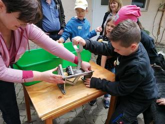 Während Frau Schmittfull die Pommes zubereitete, spielten die Kinder Sackhüpfen und auch mit Hofhund Paula. Mit viel Freude und Genuss wurden die Pommes verspeist. Die weißen waren eindeutig der Sieger in der Bestenliste der Pommes. Gestärkt ging es dann zu den Stallungen. Dort konnten die Kids Schweine, Gänse und Hähnchen besichtigen und im Rinderstall durften sie selbst die Bullen mit Futter versorgen.