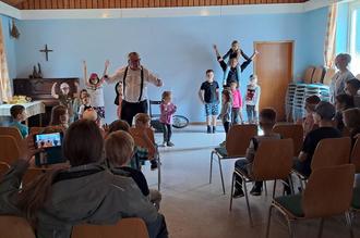 Mit Spannung erwarteten die 37 Kinder den Beginn der angekündigten Clownshow. Wer allerdings einen „richtigen Clown“ mit Kostüm und roter Nase erwartet hatte wurde enttäuscht. Hereinspaziert kam ein Mann mit schwarzer Hose, weißem Hemd und einem einfachen alten Koffer. Das soll der Clown sein?