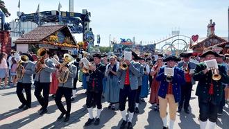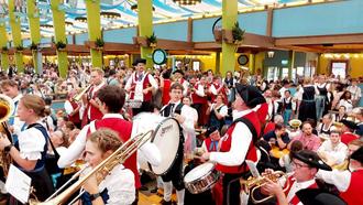 Mit dem „Frankenlied“ auf den Lippen marschierte die Gruppe der ILE Oberes Werntal schließlich auf die Wiesn ein, bis hin zum Zelt der „Ochsenbraterei“, um die reservierten Plätze einzunehmen. Jeder erhielt eine Maß und ein Hendl zur wohlverdienten Stärkung. Ab diesem Zeitpunkt war Feiern angesagt und das besondere „Gemeinschaftsgefühl“ auf der Wiesn wurde spürbar. Wiederholt standen die Musiker auf den Bänken und musizierten, die Trachtler unterstützten mit Gesang, in den Gängen wurde getanzt. Dank der spielfreudigen Musiker der ILE Oberes Werntal wurde reichlich „fränkische Atmosphäre“ im Münchener Festzelt versprüht. Gegen Spätnachmittag, nach Ablauf der Reservierungszeit, ging es zurück zu den Bussen. Auch dort wurde weiter getanzt und musiziert, ein besonderes Erlebnis für alle Teilnehmer. In bester Stimmung, wenn auch müde wurde die Heimfahrt angetreten.