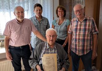 Über die Verleihung des Ehrenzeichens in Gold des Verbandes Wohneigentum an Stefan Schraut (vorne) freuen sich die Vorstandsmitglieder der Siedlergemeinschaft (von links) Stefan Valentin, Wolfgang Berninger, Silvia Siegmann und Eugen Gäb.
