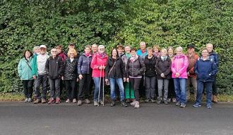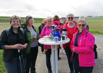 Der Himmel hellte sich auch immer mehr auf. Als wir den Wald verließen, wartete eine Kaffeebar auf uns: Brigitte und Wolfgang Berninger hatten mit viel Liebe eine schöne Tafel mit Kuchen und Kaffee aufgebaut, die sofort alle Lebensgeister wieder weckte. Hier noch einmal ein großes Dankeschön an die Kuchenbäckerinnen, die uns diesen Gaumenschmaus ermöglicht haben. Gestärkt griffen wir die letzte Etappe unserer Wanderung an.