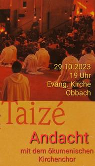 Am Sonntag, 29.10.2023, findet um 19 Uhr in der evangelischen Kirche in Obbach eine Taizé-Andacht statt. Der ökumenische Kirchenchor und Pfarrerin Bandorf gestalten diese Andacht. Herzliche Einladung zum Zuhören und Mitsingen.
