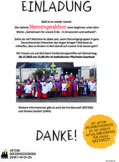 Wir freuen uns auf dich beim Vorbereitungstreffen am Donnerstag, 28.12.2023 um 15.00 Uhr im katholischen Pfarrheim Euerbach.