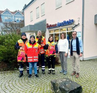 Auf dem Foto von links nach rechts: Gerd Brand, 2. Kommandant Sebastian Pfaff, stellv. Staffelleiter Ronny Geier mit Bibi, Ulrike Brand, Frau Reichelt und Heinz Wernke von der Rathaus-Apotheke in Euerbach