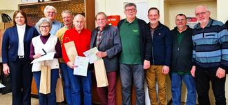 Auf dem Bild sind von links nach rechts: 1. Bürgermeisterin Simone Seufert, Heinz Fredrich und Elisabeth Blüml (silberne Ehrennadel), Stefan Dittmann (20 Jahre), Ludwig Spiegel (30 Jahre), Alfred Werner (Ehrenmitglied), Kurt Lieb (1. Vorstand), Klaus Winkler (Landesvorstandsmitglied), Klaus Helmerich (Kassier), Georg Grembler (ehem. Landesvorstandsmitglied)