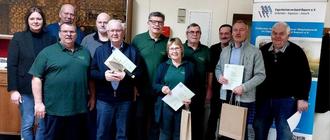Auf dem Bild von links nach rechts: Bürgermeisterin Simone Seufert, Georg Birk (40 Jahre), Kassier Klaus Helmerich, Lothar Josua (10 Jahre), Gerhard Bader (50 Jahre), 1. Vorstand Kurt Lieb, Iris Helmerich (30 Jahre), 2. Vorstand Dieter Blüml, LVM Klaus Winkler, Edwin Wehnert (für Fritz Wehnert,60 Jahre), Karl Eschenbacher (40 Jahre)