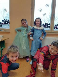 Am letzten Schultag vor den Faschingsferien herrschte ein buntes Treiben in unserer Schule. Die letzten beiden Schulstunden standen ganz im Zeichen des Faschings. Die Kinder durften verkleidet in die Schule kommen. So konnte man neben Superhelden/innen, Zauberer/Zauberinnen und Polizist/innen, auch viele Tiere, wie Zebras, Tiger und Marienkäfer, in den Gängen und den Klassenzimmern bestaunen. Auch unsere Lehrerinnen hatten Spaß an der Kostümierung, so dass plötzlich Katzen, Einhörner, Steinzeitmenschen und sogar eine Popcorntüte unterrichteten. So konnte die Sause starten.