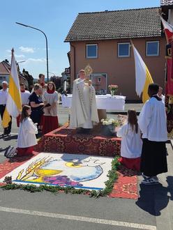 Dieses Altarbild zeigt den Betrachter das symbolische Bild. Brot und Wein und den Heiligen Geist in Form einer Taube und der Kreis ist unser Planet Erde. Diese Darstellung wurde mit feinsten Quarzsand in verschiedenen bunten Farben hergestellt. Auf dem Betrachter wirkte es, wie auf den Gehweg gemalt. Gestaltet haben das kleine Kunstwerk Martina Wachter, Iris Eck, Claudia Popp und Sonja Porzelt von der Kirchengemeinde Sankt Josef Thonberg. An dieser Station wurde der Segen für die beiden Gemeinden Küps und Weißenbrunn erbeten.