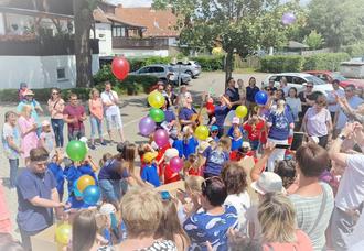 Bei herrlichem Wetter war es dann soweit und die Kinder begannen mit ihren Aufführungen im Außenbereich der Schule, wo das Kindergartenfest zum ersten Mal stattfand. Krippen- und Kindergartenkinder hatten Lieder zum Thema „Farben“ eingeübt und sangen diese mit Untermalung durch Bilder, Spiel und Bewegungen. Am Ende des Liedes „Alle Farben kenne ich“ öffneten die Kinder dann die bereit stehenden großen Kartons und ließen viele bunte Luftballons in den Himmel steigen.
