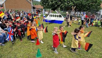 Im Mai war es endlich soweit, wir feierten unser großes Sommerfest unter dem Motto „Wir sind Kinder einer Welt und fliegen um die Welt.“ Mit unserem selbstgebauten Flugzeug besuchten wir alle Kontinente. Durch die verschiedenen Tänze und Lieder lernten wir alle Menschen dieser Erde kennen. Für alle Kinder war die Aufführung eine große Freude und wurde mit viel Applaus aller Besucher belohnt. Im Anschluss war für alle Kinder viel geboten: Kinderschminken und Tattoos, afrikanische Ketten wurden gestaltet und Klickarmbänder bemalt. Beim großen Flugzeug - Parcours konnten sich die Kinder austoben. Für das leibliche Wohl wurde mit Torten, Kuchen und Kaffee, Bratwürsten und Steaks bestens gesorgt. Der Elternbeirat lud zu leckeren Cocktails und Obst an ihrer Cocktailbar ein. Zum Abschluss fuhr der Eiswagen für alle Kinder vor. Ein tolles Sommerfest ging somit zu Ende und wir bedanken uns recht herzlich für die große Hilfe bei allen fleißigen Eltern und dem Elternbeirat.