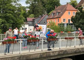 Nach getaner Arbeit richtete der 1. Vorsitzende Peter Weber Dankesworte an alle Beteiligte. Allen voran dem Küpser Bürgermeister, der es sich nicht nehmen ließ, dem Spektakel beizuwohnen. Im Anschluss verweilten die Protagonisten und auch einige Interessierte noch eine Zeit lang an Ort und Stelle. Alle waren sich einig, dass der Blumenschmuck an der Rathausbrücke sowohl für Einheimische als auch Besucher ein Blickfang ist.