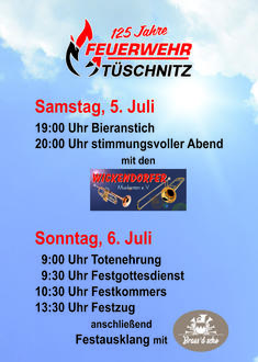 Dank der engagierten Zusammenarbeit aller Tüschnitzer Vereine ist die Wehr gut gerüstet für die Besucher. Nach dem Bieranstich am Samstag, 5. Juli, durch den Schirmherrn, Bürgermeister Bernd Rebhan, machen die „Wickendorfer“ den Auftakt. Der Sonntag steht ganz im Zeichen der Feuerwehr. Nach der Totenehrung am Ehrenmal gestaltet Pfarrer Jochen Pickel den Zeltgottesdienst. Beim Festkommers stehen der Rückblick auf die bewegte Vereinsgeschichte und die Ehrungen langjähriger Aktiver und Vereinsmitglieder neben den Ansprachen der Ehrengäste im Mittelpunkt. Den Festnachmittag gestalten „Brass`d scho“, die in der Marktgemeinde mittlerweile Kultstatus genießen.