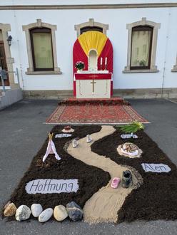 Der Weg führte zu zwei Altären welche schon in den frühen Morgenstunden durch engagierte Frauen und Männer aufgebaut wurden. Auch halfen Ministranten und Firmlinge beim Entstehen mit.