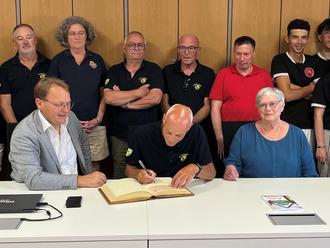 Bürgermeister Bernd Rebhan freute sich über den Besuch der Abordnung aus Plouay mit Kommandant Yves Philippe an der Spitze, ganz besonders über die große Anzahl an Jugendfeuerwehrleuten. Er lobte die Freiwillige Feuerwehr Tüschnitz für die großartige Kontaktpflege zu den Freunden aus Plouay und über 30-jährige Verbundenheit zur Patenwehr. Jean-Luc Perron und Christophe Morgant hätten den Kontakt über die vielen Jahren ununterbrochen gepflegt, würdigte der Bürgermeister den Einsatz der beiden Wehrleute, die mittlerweile aus dem aktiven Dienst ausgeschieden sind. Auf Tüschnitzer Seite habe sich Georg Kreul als Motor der Partnerschaft erwiesen. Zudem würdigte der Bürgermeister die erstklassige Unterstützung von Suzel Biernat. Christophe Morgant bedankte sich seinerseits für die freundliche Aufnahme in der Marktgemeinde und beim Bürgermeister für den Empfang im Rathaus, der mit einem Eintrag ins Goldene Buch der Marktgemeinde abgeschlossen wurde.