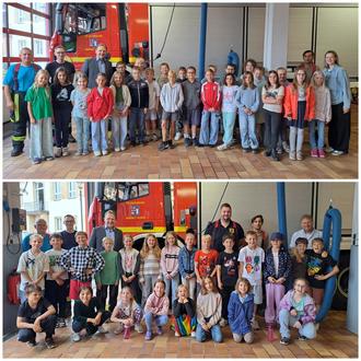 Gemeinsam mit Lehrerin Frau Pülz und Lehrer Herr Weiß, machten sich die Kinder der Klassen 3a und 3b der Küpser Grund- und Mittelschule auf den Weg, um der Freiwilligen Feuerwehr Küps einen Besuch abzustatten. Kommandant Markus Rieger empfing die interessierten Schülerinnen und Schüler recht herzlich im Küpser Feuerwehrhaus. Hinzu kam auch Erster Bürgermeister Bernd Rebhan, als Chef der Feuerwehren in der Großgemeinde Küps. Er erklärte, dass die ehrenamtliche Arbeit der Kameraden und Kameradinnen sehr wichtig und nicht hoch genug zu schätzen sei. Er dankte den Männern und Frauen für die Bereitschaft, zu jeder Tages- und Nachtzeit für oft auch schwierige Einsätze parat zu sein.