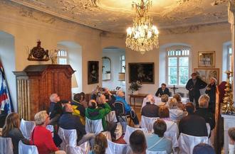 Im Neuen Schloss stand der Jagdsaal im Mittelpunkt. Dr. Barbara Fischer-Kohnert und Dr. Tillmann Kohnert zeigten die vielfältigen Details der Stuckdecke auf.