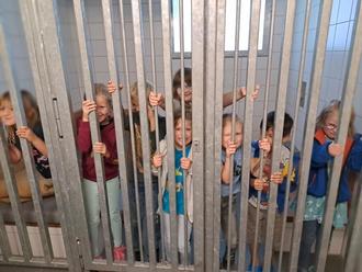 Es ist nicht einfach einen Termin zu bekommen, aber wir haben es geschafft. Wir durften uns die Kronacher Polizeistation anschauen. Herr Sesselmann, der Kinder- und Jugendbeauftragte informierte uns auf sehr interessanter Weise über die Aufgaben und die verschiedenen Fachbereiche der Polizei. Auch zeigte und erklärte er uns die Pflichtausrüstung eines Streifenpolizisten: Schlagstock, Funkgerät, Handschellen, Taschenlampe und Pfefferspray und für extreme Notfälle, nur zum Schutz und zur Verteidigung die Pistole. Anschließend führte er uns durchs ganze Haus. Die Arrestzelle war für die Kinder das Beeindruckendste. Während der Regenpause durften wir auch noch ein Polizeiauto inspizieren. Alles war für unsere Großen höchst spannend und aufregend.