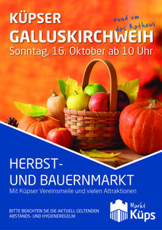 Unter dem Motto: Kreativ, kunstvoll, köstlich lockt alljährlich zur weithin beliebten Gallus-Kirchweih der Markt Küps zahlreiche Besucher.