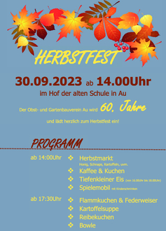 Am 30.09.23 veranstaltet der Obst- und Gartenbauverein Au ein Herbstfest ab 14 Uhr im Schulhof in Au. Der Verein feiert in diesem Jahr sein 60-jähriges Jubiläum, was besonders hervorzuheben ist.