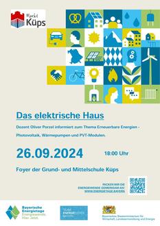 Im Rahmen der Bayerischen Energietage lädt der Markt Küps zum kostenlosen Vortrag von Oliver Porzel unter dem Motto "Das elektrische Haus" am Donnerstag, den 26. September 2024 um 18.00 Uhr ins Foyer der Grund- und Mittelschule Küps, Am Hirtengraben 7, ein.