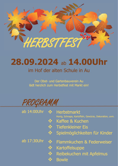 Am 28.09.24 veranstaltet der Obst- und Gartenbauverein Au wieder ein Herbstfest ab 14 Uhr im Schulhof in Au.