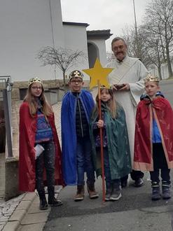 Die Sternsinger aus Johannisthal zusammen mit Diakon Diethard Nemmert nach dem Dreikönigsgottesdienst.