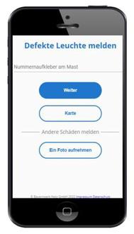Das Melden von Straßenbeleuchtungsschäden erfolgt ganz einfach über die Auswahl der Brennstellennummer, die auf jedem Lampenmasten aufgeklebt ist, sowie der Nennung eines Schadenstypens. Alternativ besteht die Möglichkeit, die defekte Lampe über die Kartenfunktion auszuwählen. Haben Sie auf Ihrem Smartphone die GPS-Funktion aktiviert, wird Ihnen der Standort der Straßenlampe direkt in der Karte angezeigt.