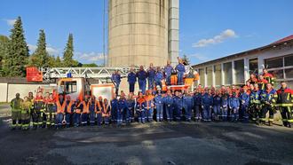 Die Heldinnen und Helden von morgen: Die Jugendfeuerwehren aus Burkersdorf, Johannisthal, Küps, Neuses, Oberlangenstadt, Theisenort und Schmölz gemeinsam mit einigen ihrer Betreuer auf dem Übungsgelände der Schreinerei Lang in Johannisthal.