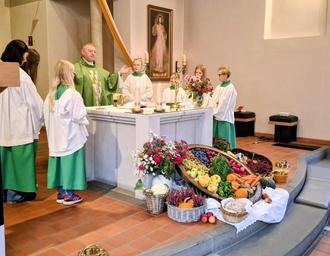 Im Festgottesdienst zum Erntedank wurde Gott gelobt und gedankt für die reiche Ernte. Pfarrvikar Norbert Lang stellte das Bewusstsein in den Mittelpunkt zu Gott und der Natur. In einigen Beispielen zog er Bilanz zwischen Evangelium und das Heute. Die Ministranten Felia Merklein, Sophie Mück, Oskar und Lotta Rebhan machte sich ebenfalls Gedanken über die Schule, Hausaufgabenbetreuung, Seniorenheimen und Supermärkte. Sie sprachen über das Für und Wider der einzelnen Probleme. Am Schluss der Feier wurden die Erntegaben gesegnet und Pfarrvikar Norbert Lang bedankte sich bei allen Mitwirkenden. Ministranten verteilten an die Gottesdienstbesucher herrliche Äpfel.