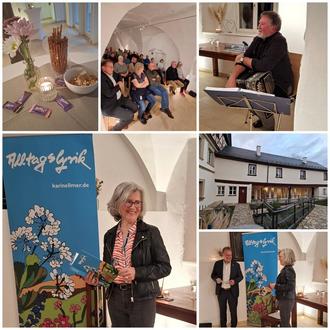 Unter dem Titel „Schokolade und andere Sehnsüchte“ las Karin Ellmer aus ihren Gedichtbänden „nurso“, „weiterso“ und „genauso“ vor. Mit ihrer Alltagslyrik berührte sie das Publikum, regte zugleich aber auch zum Schmunzeln und Nachdenken an. Ihre Texte, die keineswegs schwer oder langweilig waren, kreisten um Themen wie das Verliebtsein, Freundschaft, das Dasein, der eigenen Identität, Ängste, aber auch die Suche nach dem Glück und die Sehnsucht nach unbeschwerten Zeiten der Kindheit.