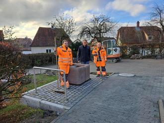 An dieser Stelle befand sich ein Wasserbecken, das komplett erneuert werden musste. Bürgermeister Bernd Rebhan dankte dem Bauhofteam für die Ausführung der Arbeiten (von links) Manuel Büttner, Bürgermeister Bernd Rebhan und Dominik Schnell.